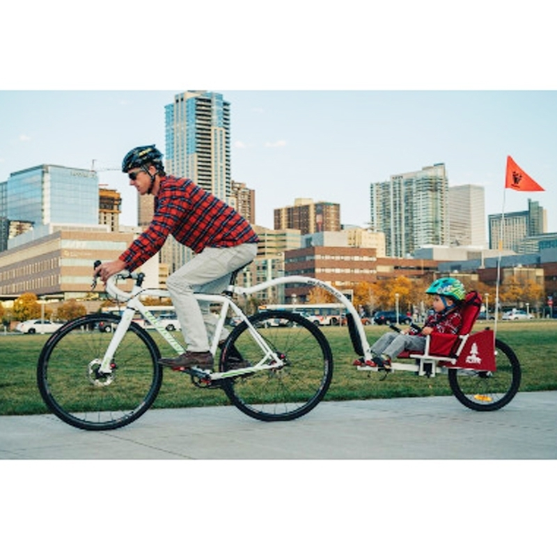 Ce concept de remorque à pédale pour jeunes enfants réduit l’encombrement sur la route puisqu’elle suit parfaitement la trajectoire du vélo tracteur.